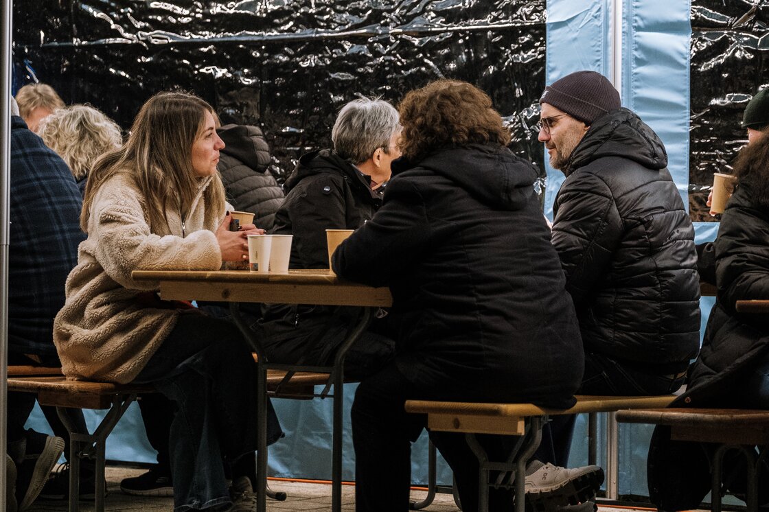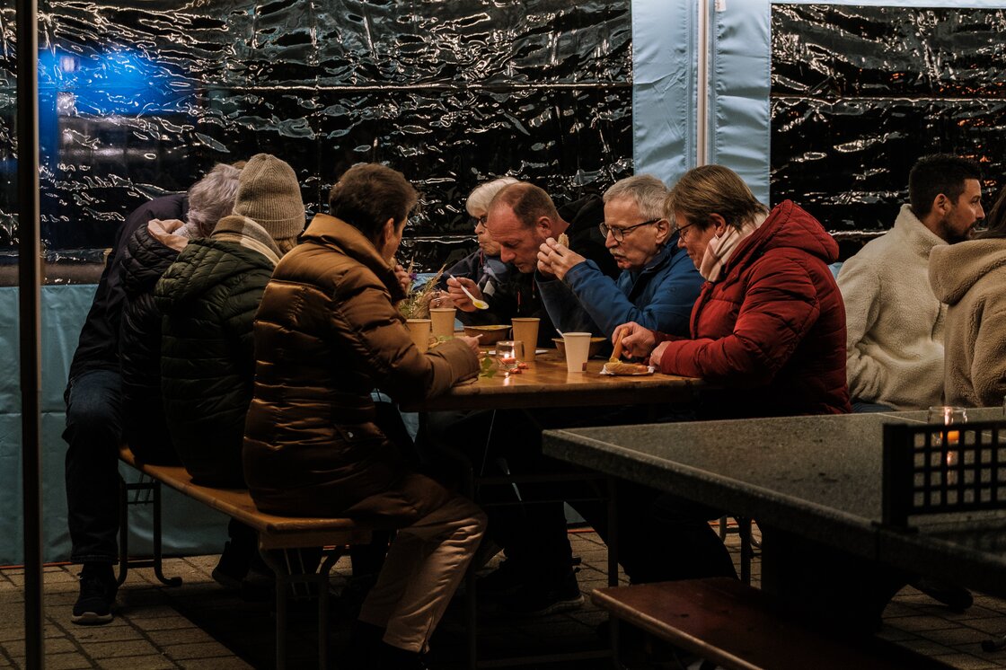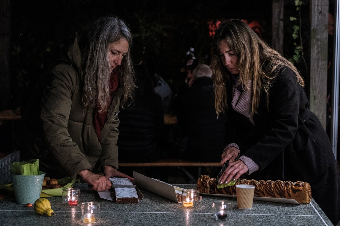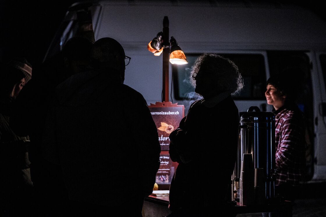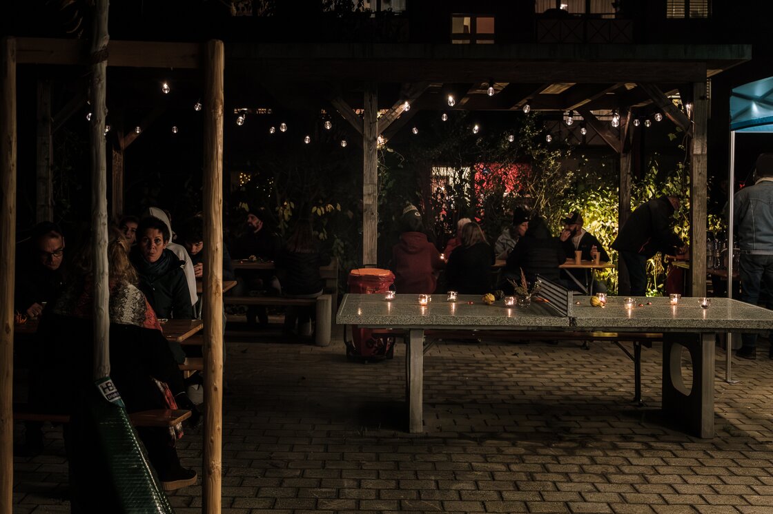 Bei Kürbissuppe, Wurst vom Grill, heissen Marroni und Kuchen sassen die Nachbar:innen am Herbstznacht bei Kerzenschein an dem dunklen Oktoberabend gemeinsam am Tisch, Bekannte Gesichter trafen sich wieder, neue Kontakte entstanden, Kinder spielten bis in den frühen Abend im Hof.