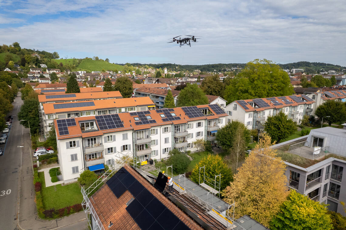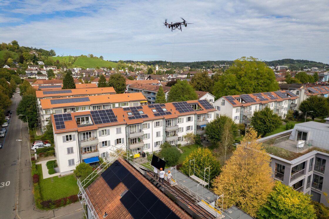 Ein ungewohnter Anblick in der Siedlung Flüelistrasse: Eine Drohne bringt Solarpanels aufs Dach. In Zusammenarbeit mit der Partnergenossenschaft Wintisolar werden 164 Module für die neue Photovoltaikanlage montiert. Sie produziert rund 83’000 Kilowattstunden Strom pro Jahr – für den direkten Verbrauch in der Siedlung. Was nicht verbraucht wird, speisen wir zurück an Stadtwerk Winterthur. Insgesamt hat die HGW bereits 31 Solaranlagen gebaut...