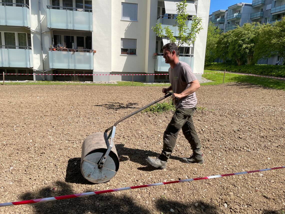 Eine Blumenwiese entsteht: In der Siedlung Seenerstrasse pflügen unsere Gärtner die oberste Humusschicht um – der erste Schritt zur Blumenwiese. Danach heisst es: warten, planieren, säen, walzen und nochmals warten. Mit Geduld und Pflege entsteht so eine lebendige Wiese, in der es summt, krabbelt und flattert – ein wertvoller Beitrag zur Biodiversität.