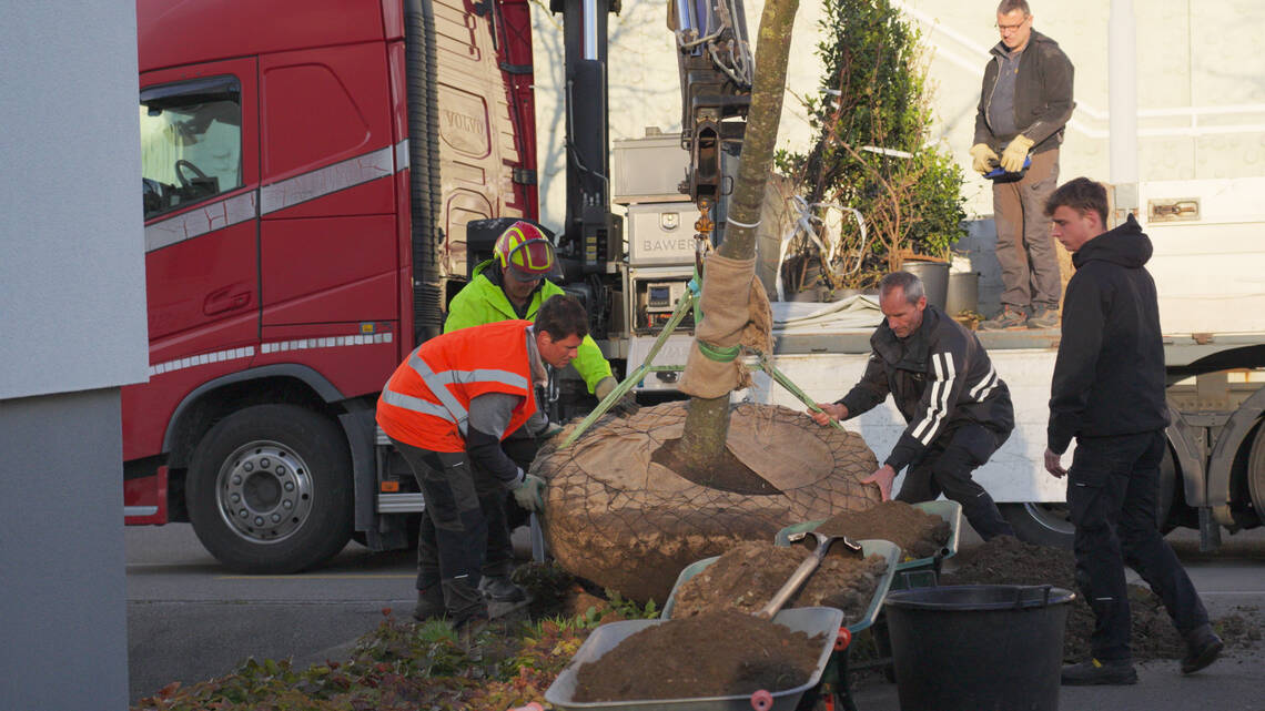 Willkommen Linde! Unsere Gärtner und Hauswarte pflanzen an der Siedlung Seuzacherstrasse in perfekter Teamarbeit eine Linde. Warum eine Linde? Weil sie Schatten spendet, das Mikroklima verbessert und wichtig ist für Insekten - besonders für Bienen. Und sie wird lange bleiben: Gut gepflegt kann der Baum weit über 100 Jahre alt werden.